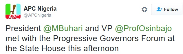 According to a report on Punch Newspapers, the chairman of the Progressives Governors Forum (PGF) and Governor of Imo State, Rochas Okorocha, had initially told State House correspondents at the end of the meeting that the governors had decided to intervene in the crisis in the National Assembly, without giving details of their intervention.
