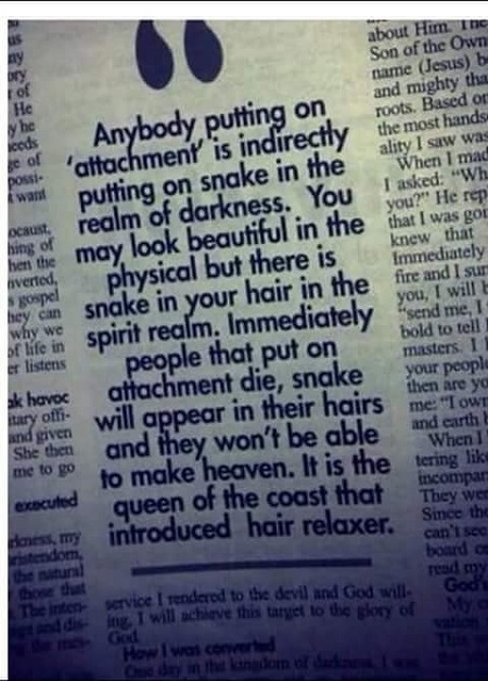 According to the yet unknown writer, who is supposedly a born-again Christian, the hair attachment women put on is snake in disguise.