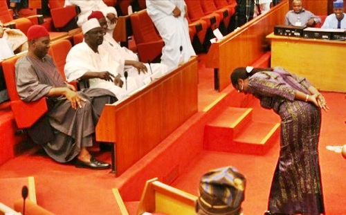 Nigerian Minister of Foreign Affairs, Vivian Okeke, bowing before the Nigerian senate
