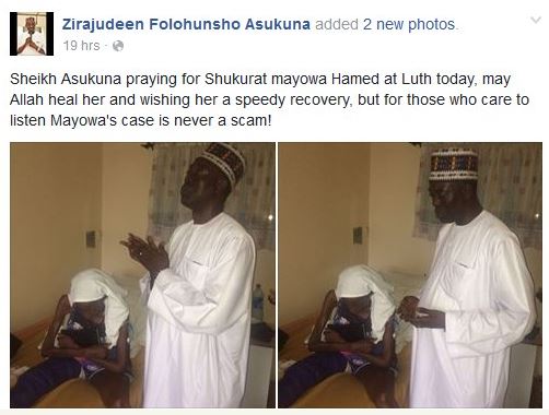 An Islamic religious leader, Sheikh Zirajudeen Folohunsho Asukuna has released touching photos of his emotional encounter with seriously sick Mayowa Ahmed who is currently receiving treatment at the LUTH pending on her imminent trip abroad.