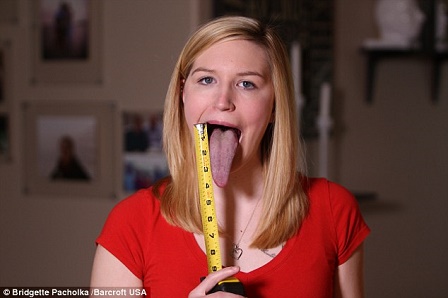 According to Dailymail, Adrianne Lewis, from Michigan, says her tongue is an unbelievable four inches long, giving her the unique ability to not only lick her nose, chin and elbow but also - shockingly - her eye.