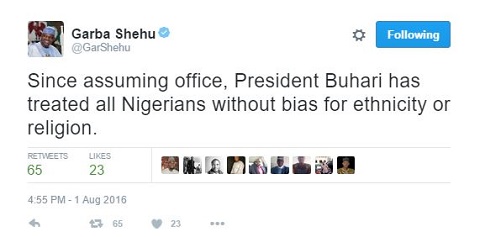 Garba Shehu wrote: "Since assuming office, President Buhari has treated all Nigerians without bias for ethnicity or religion."