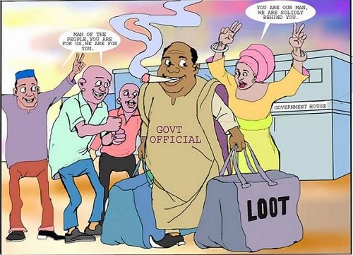 In the second cartoon picture, the character representing a politician/public office holder could be seen flaunting his loot publicly and being hailed by the deprieved people.