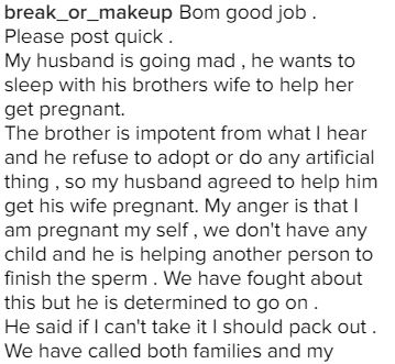 A woman has told a really stunning story about her husband's bizarre quest to put his brother's wife in the family way.