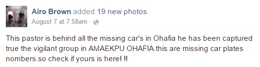 "This pastor is behind all the missing car's in Ohafia he has been captured true the vigilant group in AMAEKPU OHAFIA.this are missing car plates nombers.so check if yours is here! !!"