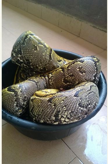 The snake is currently being processed for eating. Pythons are not everyday snakes in Lagos.