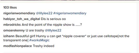 A young Nigerian lady who is also venturing into professional modeling has been taken to the cleaners by her Instagram followers for not wearing bra.