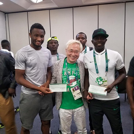 The man identified as Dr. Katsuya Takasu kept his promise by giving the team $390,000. He presented a check of $190k to Mikel Obi and $200k cheque to Samson Siasia, a total of $390k.
