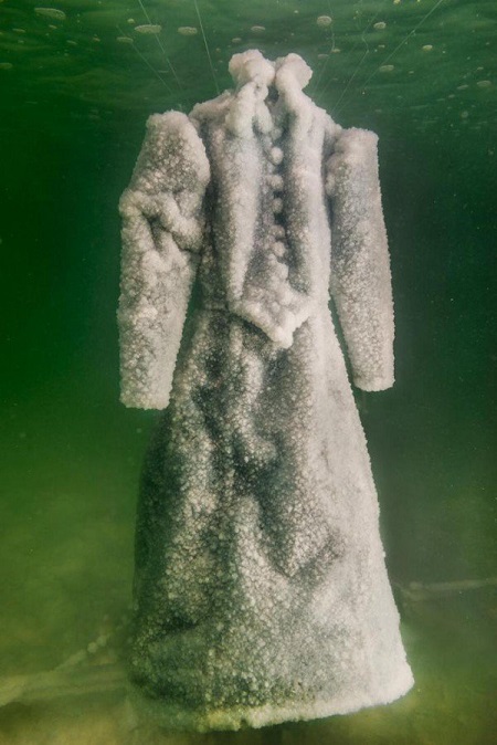 As the salt in the water adhered to the fabric, the black dress gradually became stiffer and changed its color from charcoal black to pearly white. “It looks like snow, like sugar, like death’s embrace,” the artist poetically said in a statement.