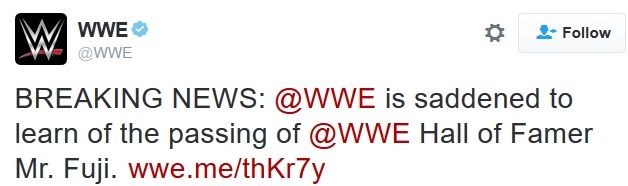"WWE is saddened to learn that WWE Hall of Famer Harry Fujiwara, known to WWE fans as Mr. Fuji, passed away Sunday morning at the age of 82.