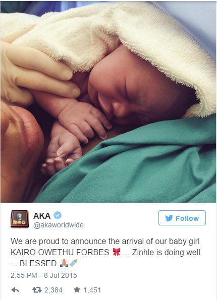 The excited 27-year old rapper took to his Instagram page to post a picture of his baby on with a captivating message. “We are proud to announce the arrival of our baby girl Kairo Owethu Forbes, She is healthy and her mother is feeling well, thank you to all the doctors and nurses at Sandton Medi Clinic.”