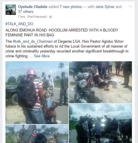 A suspected ritualist has been apprehended by the security agents after he was caught with blood stained female panties. The incident which took place in Rivers State was reported by Oyelude Oladele who wrote: