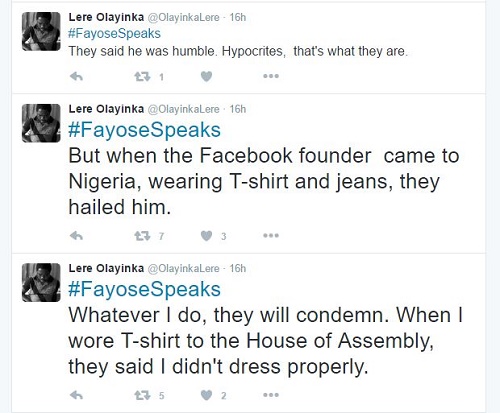 Fayose further asked "But when the Facebook founder came to Nigeria, wearing T-shirt and jeans, they hailed him."