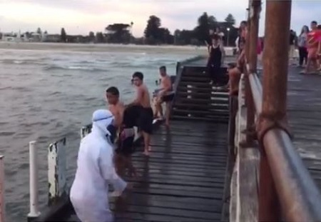 In the video, the man is seen dressed in white Arab clothes targeting unsuspecting people and dropping a black bag supposedly, a bomb on them.