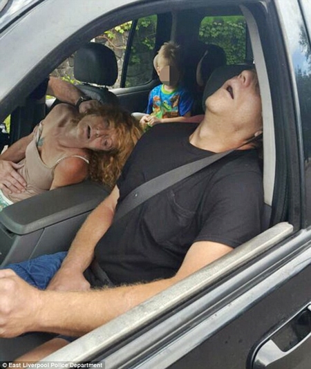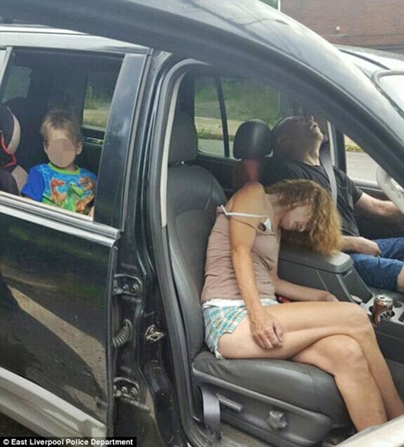 Police in East Liverpool, Ohio, shared on Facebook this shocking image showing parents passed out in their car with the woman's child in the backseat after a suspected heroin overdose