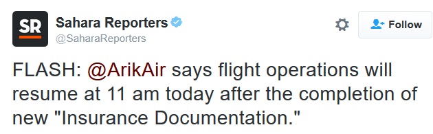 “With the regularization of the required documents relating to the renewal of the insurance, Arik Air will be resuming its normal flying schedule from 1100 hours on Wednesday, September 14, 2016.