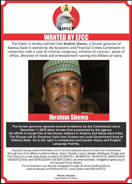 The antigraft agency, EFCC has declared a former state governor, Ibrahim Shema wanted for criminal conspiracy, inflation of contracts, abuse of office, diversion of funds and embezzlement running into billions of naira.