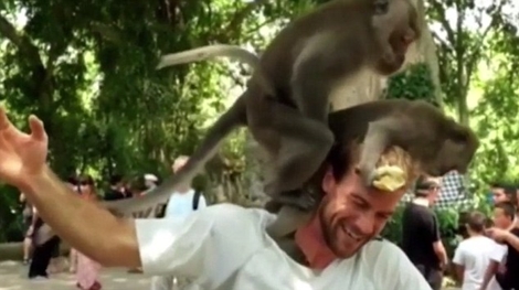 A tourist visiting a monkey sanctuary has learned the hard way never to work with animals after he was filmed when two horny primates started copulating furiously on top of man's head.