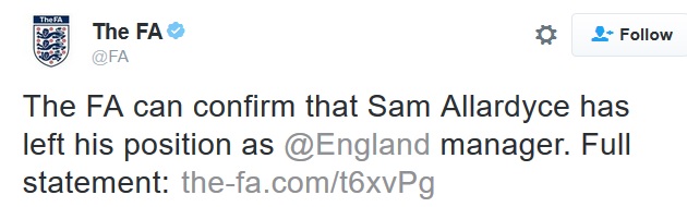 "The FA can confirm that Sam Allardyce has left his position as England manager. Allardyce’s conduct, as reported today, was inappropriate of the England manager.