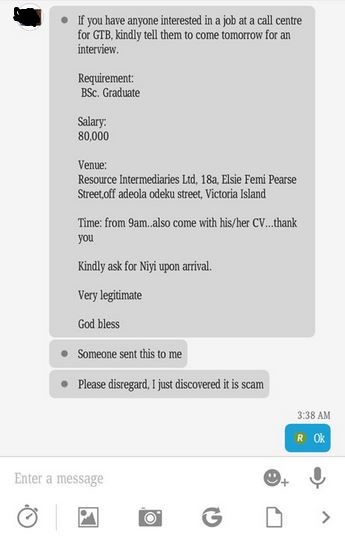 Some Lagosians yesterday, 27th of September at around 11pm received a message through the conventional Whatsapp and BBM messaging applications inviting them for an interview with Guarantee Trust Bank for job openings at the level of Call Centre Agents for B.sc holders.