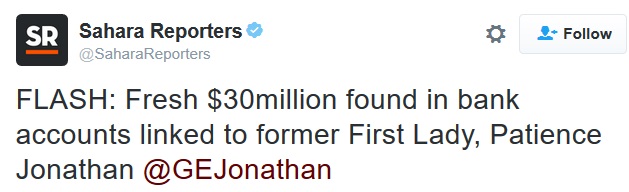 "FLASH: Fresh $30million found in bank accounts linked to former first lady, Patience Jonathan," SaharaReporters