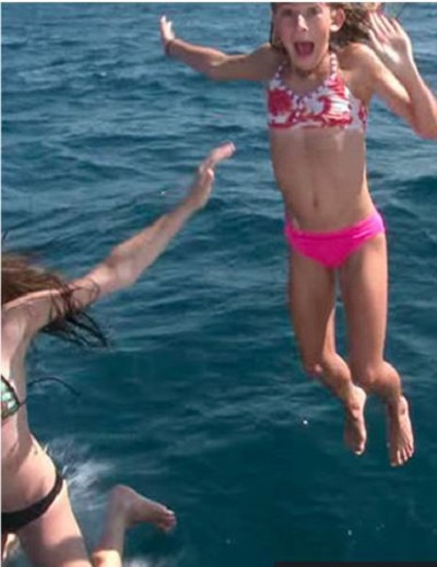 While standing on the edge of the boat ready to take another leap, one of the girls yells: "What is that?!"