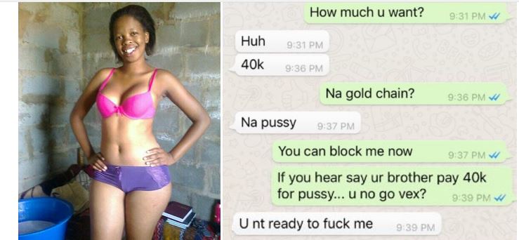The screen-munched conversation has hit the online media with maximum views recorded. It should be noted that the pleasure industry in Nigeria where the prostitutes ply their trade has suffered a case of hyper-inflation which has forced men to embrace masturbation or stay faithful to their usual s*x partners.