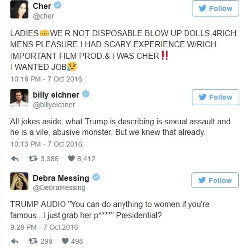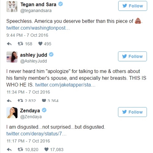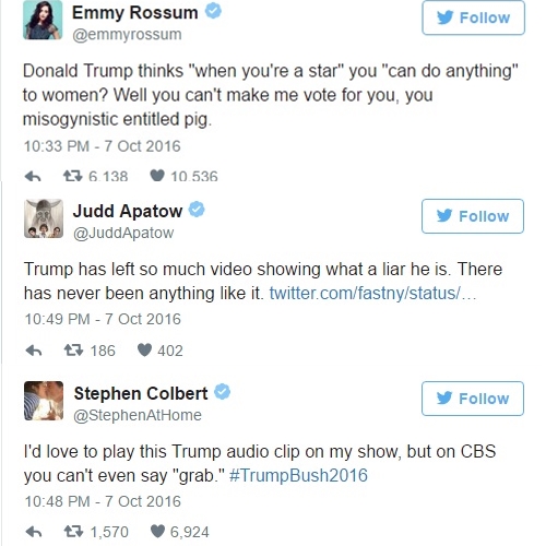 Some of Hollywood's most recognizable names are taking to Twitter to share their thoughts in the wake of an extremely graphic conversation between U.S presidential candidate, Donald Trump, Billy Bush and several others leaking online.