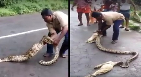 Man Wrestles Huge Python that Swallowed Two Animals and Forces it to Vomit It (Photo+Video)
