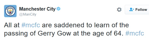 "Everyone at Manchester City FC is saddened to learn of the passing of Gerry Gow at the age of 64 following his brave battle with illness.