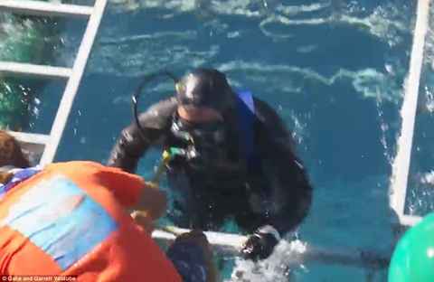 At one point, you can see blood coming from the shark's gigantic mouth. The good news is the diver was okay after dive instructors lifted the top of the cage to let the shark out.