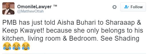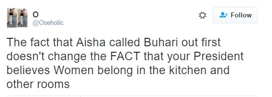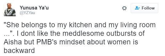 Following comments by President Muhammadu Buhari that his wife belongs to his kitchen, Nigerians have come out to express their opinions on the matter.