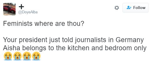 In a swift reaction to her statements, President Buhari who is currently in Germany, said Aisha belongs only in "his kitchen, his living room and the other room."