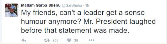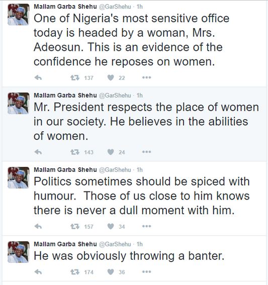 In a series of tweets, Shehu said, "My friends, can't a leader get a sense humour anymore? Mr. President laughed before that statement was made. He was obviously throwing a banter. Politics sometimes should be spiced with humour. Those of us close to him knows there is never a dull moment with him. Mr. President respects the place of women in our society.