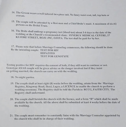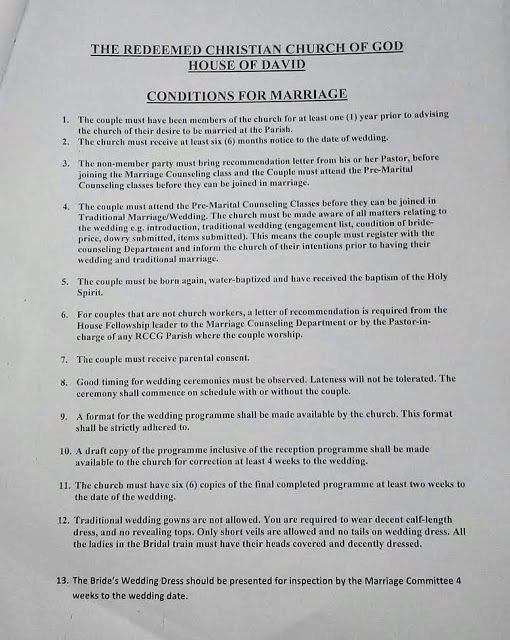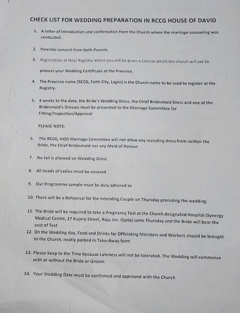 A list which is reportedly a mandatory guideline for couples who want to get married in Redeemed Christian Church of God (RCCG) House of David, has emerged online and has already gone viral.