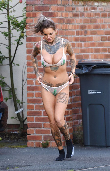 Jemma Lucy showed off her tattoos, wearing an ill-fitting bra, white thong and black socks