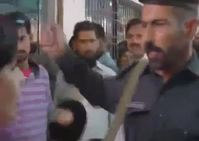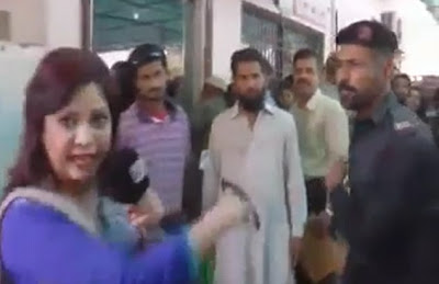 A Pakistani police guard was caught slapping a female journalist on camera while she was filming a TV report.