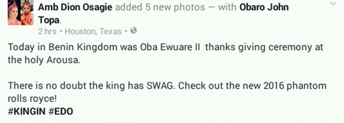 "There is no doubt the king has SWAG. Check out the new 2016 phantom rolls royce! #KINGIN #EDO," Osagie wrote.