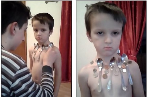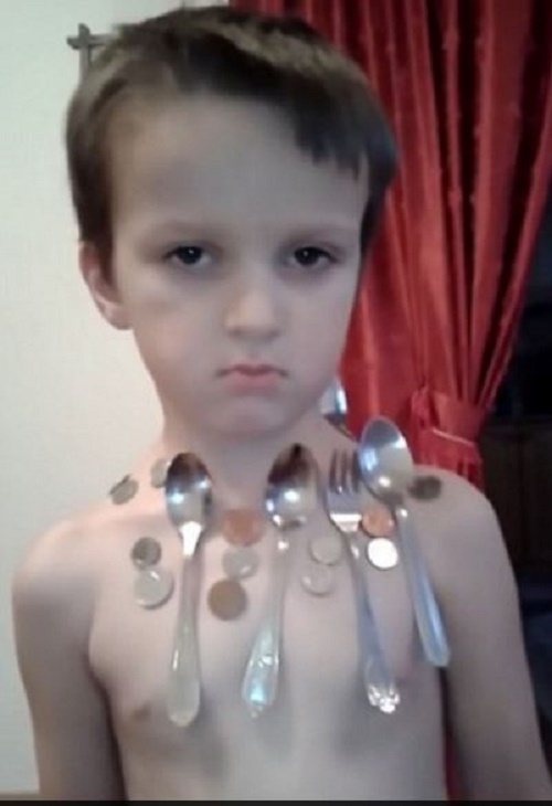 The boy has been filmed with cutlery and coins magneted to his chest. His family recorded the footage and posted it online, where it has since gone viral with thousands of views.