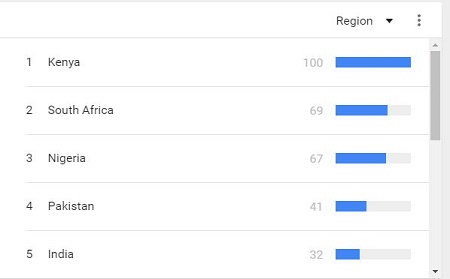 Kenya - a country with strong anti-gay laws - tops the Google trends rankings for both ‘gay sex pics‘ and ‘gay porn pics‘, with an extraordinarily high search index.