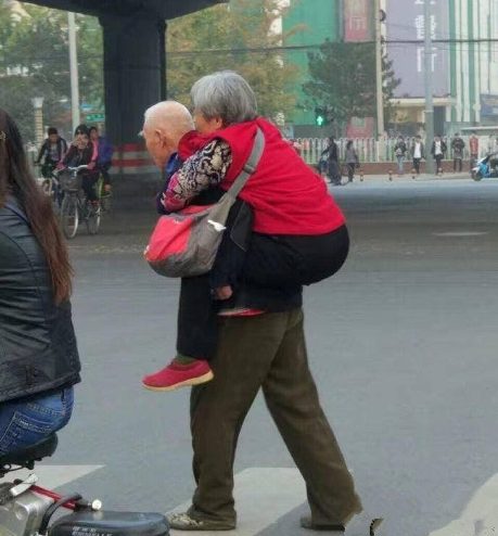 An old man has been pictured carrying his wife on his back while crossing the boisterous street on Tuesday in Daxing district in Beijing.