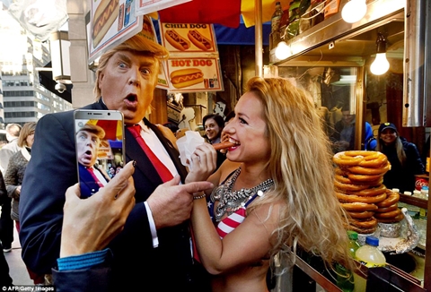 A fake Donald Trump took Times Square in New York by storm on Tuesday afternoon along with a group of scantily-dressed women as part of a project by spoof photographer, Alison Jackson.