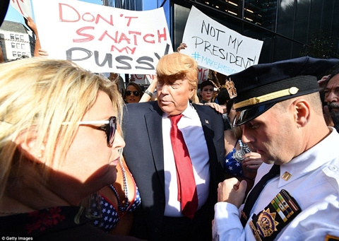Donald Trump lookalike and bikini-clad female protesters in New York