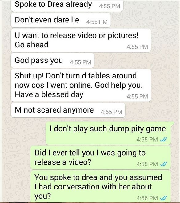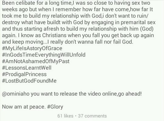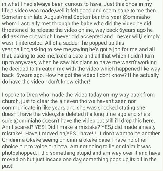 I spoke to Drea who made the video today on my way back from church, just to clear the air even tho we haven't seen nor communicate in like years and she was shocked stating she doesn't have the video,she deleted it a long time ago and she's sure @ominiaho doesn't have the video,but still i'll drop this here.‎ Am I scared? YES! Did I make a mistake? YES,i did made a nasty mistake!! Have I moved on,YES I have!!!...I don't want to be another Chidinma Okeke,seeing chidinma okeke case I have no other choice but to voice out now. Am not going to lie or claim it was photoshopped, I did something stupid and am way over it and have moved on,but just incase one day something pops up,its all in the past!'