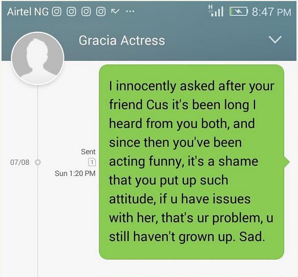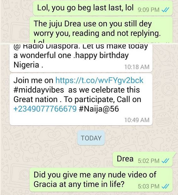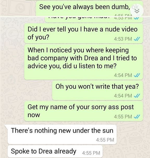 One Ominaho is currently threatening to release her n*ked photos and s*x video if some conditions are not met. Grace, has swiftly exposed her blackmailer on social media as part of damage control.