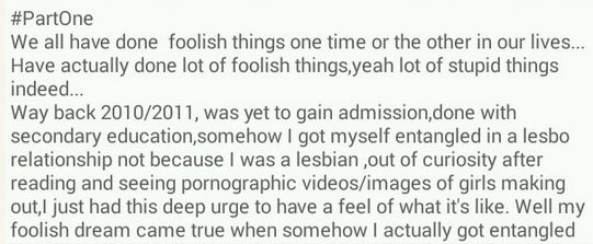 We all have done  foolish things one time or the other in our lives...Have actually done lot of foolish things,yeah lot of stupid things indeed...Way back 2010/2011, was yet to gain admission,done with secondary education,somehow I got myself entangled in a lesbo relationship not because I was a lesbian ,out of curiosity after reading and seeing pornographic videos/images of girls making out, I just had this deep urge to have a feel of what it's like.‎