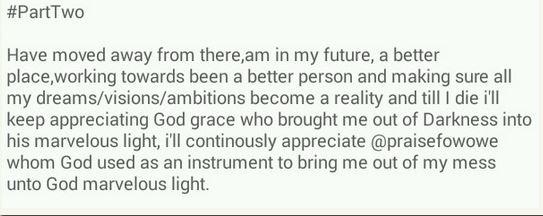 Have moved away from there,am in my future, a better place,working towards been a better person and making sure all my dreams/visions/ambitions become a reality and till I die i'll keep appreciating God grace who brought me out of Darkness into his marvelous light, i'll continously appreciate praisefowowe whom God used as an instrument to bring me out of my mess unto God marvelous light.