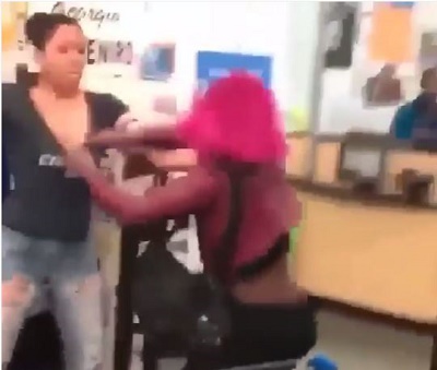 A fierce altercation has left a teacher brutalized after she was beaten mercilessly by a colleague in front of students.