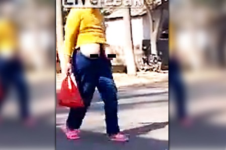 The video shows a woman caught on camera casually strolling down the street with her boobs hanging down to her waist.