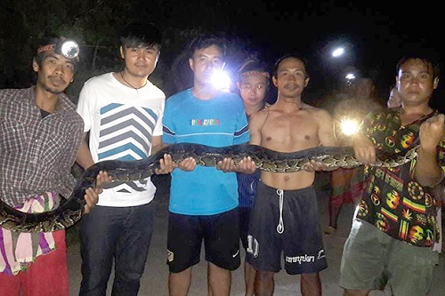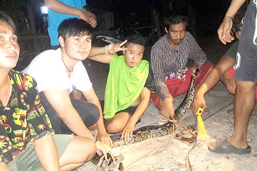 A group of eight men have rallied round to catch a killer python terrorizing residents of a neighbourhood in Thailand.